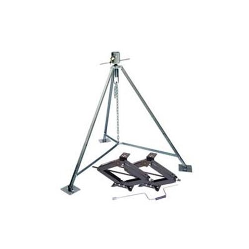 The Ultimate in King-Pin Stabilization. The only way to stabilize the front end of a fifth wheel is with a king-pin support. This area hangs over nothing, so you need support to prevent the uncomfortable movement that can occur. Great for avoid waking your partner when you get out of bed. Makes front-end ROCK SOLID. Stabilizes even the heaviest trailer. Stabilizes front-to-back and side-to-side. Unique design is fastest to set-up and store. Footpad is an incredible 5" x 5.5" to combat sinking and tilting. Self adjust for uneven terrain. Hitch cup adjust for fine tuning. Heavy duty steel construction. Weighs only 23lb. Adjust from 42" to 50". Includes padlock.